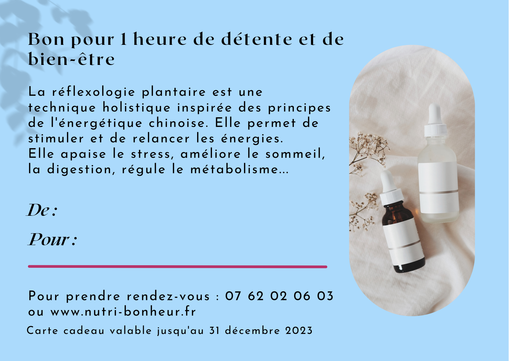A la suite de votre achat, vous recevez un bon cadeau à imprimer. Votre proche n’a plus qu’à me contacter pour bénéficier de son soin.
