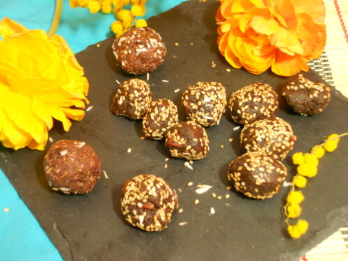 - Façonner des boules et les rouler dans le reste de la noix de coco.